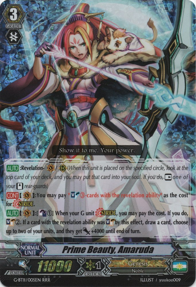 Amaruda's stride skill is definitely quality. She's able to maintain hand size and help make numbers on Ishtar turns for a counterblast. While she soulcharges one less card than Fenrir does, the one card difference is irrelevant, considering how much Genesis can soulcharge already. Amaruda can do everything the deck needs efficiently, but what differentiates Amaruda from Fenrir is the fact that Fenrir can tutor a unit from the soul. Fenrir's tutor is often overlooked, but I'm going to go over why it's amazing in the deck. Genesis generally has a giant soul, which gives you a ton of options when using this skill, making your ability to build strong fields more reliable. You'll want to be able to easily make boards so that you can get the most out of your Tahros and Ishtars.With control decks becoming much more prominent in the meta, of which are able to retire during the opponent's turn, being able to call out a rear to replace one that has been lost is a necessity to keep Ishtar turns strong. Fenrir can do this, but Amaruda can't. Even though you're technically getting the same card advantage from a draw and from a tutor, tutoring is significantly better for the deck. Amaruda's blind draw can potentially be completely irrelevant during your turn, and Amaruda has a much harder time making a formation. Amaruda's power can make numbers, but a lot of the time is minor and doesn't make a significant effect on the game. Both stride skills have definite pros and cons, but Amaruda also has her "free stride" going for her.