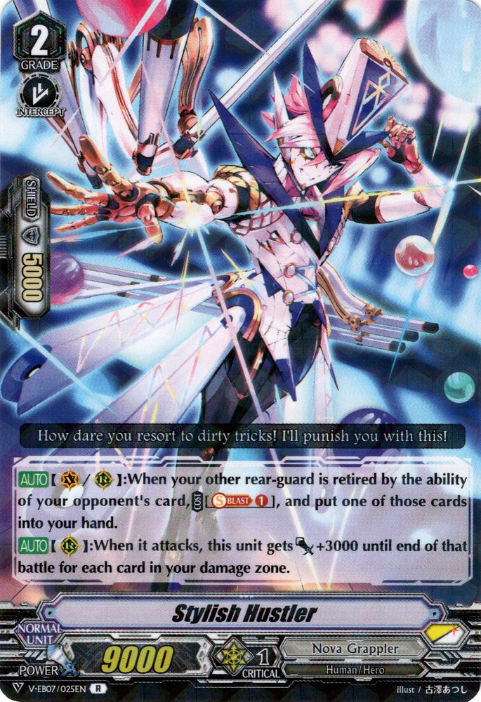 However, having so many Grade 3s does mean that the Grade 2 count has to go down. This is for the most part negligible, as your Grade 2s aside from Stylish Hustler and Warrior of Chakram don't really matter. Cup Bowler is played mostly just because it's a Hero, and you don't really have any other options. It is worth mentioning that it makes 22k on Accel II if Miss Splendor is in play. Feel free to try Boomerang Thrower, but I've found his countercharge to be too slow and his soulcharge to be unnecessary. Brutal Jack also exists, and a free 24k Accel II beater is nothing to laugh at, but I've chosen not to use him because he lacks the >Hero< race.